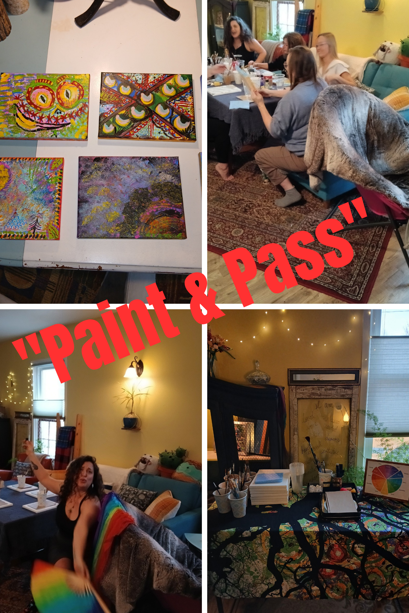 A community building experience with a focus on relinquishing control. It is not about painting talent or skill. Each canvas is passed around from one person to the next in time intervals...everyone paints everyones! A collaboration project. A surrender of control typically happens with the passing of the work when its time to "drop the brushes".